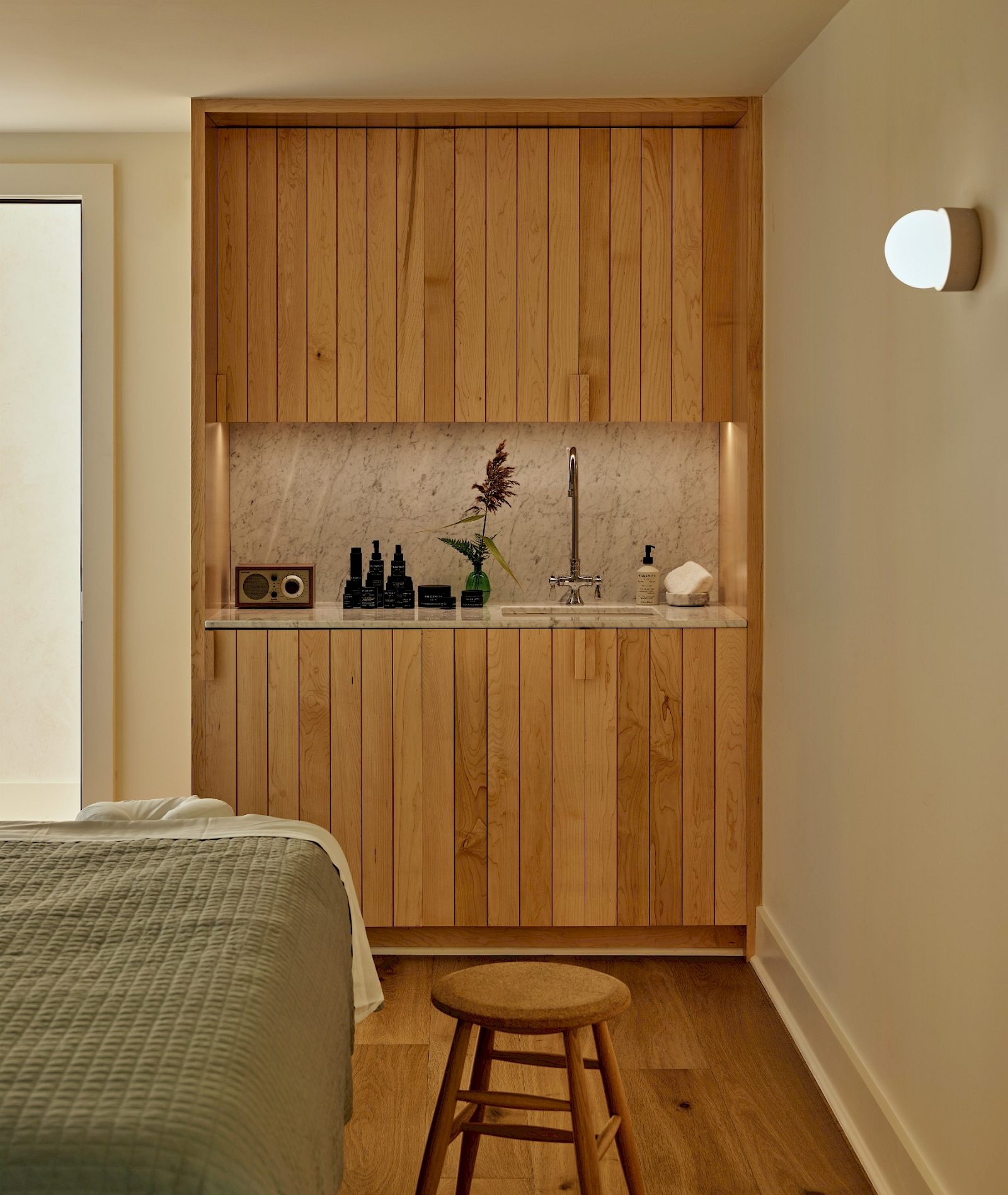 The wet area at the heart of the Belden bathhouse may be enjoyed as a circuit: first a dry sauna, a salt scrub and drenching overhead shower, a steam room, followed by a 225-gallon Japanese Ofuro tub for hydrotherapies and cold plunges. One of the two available treatment rooms connects directly to the baths. The other has two treatment beds for simultaneous treatments.