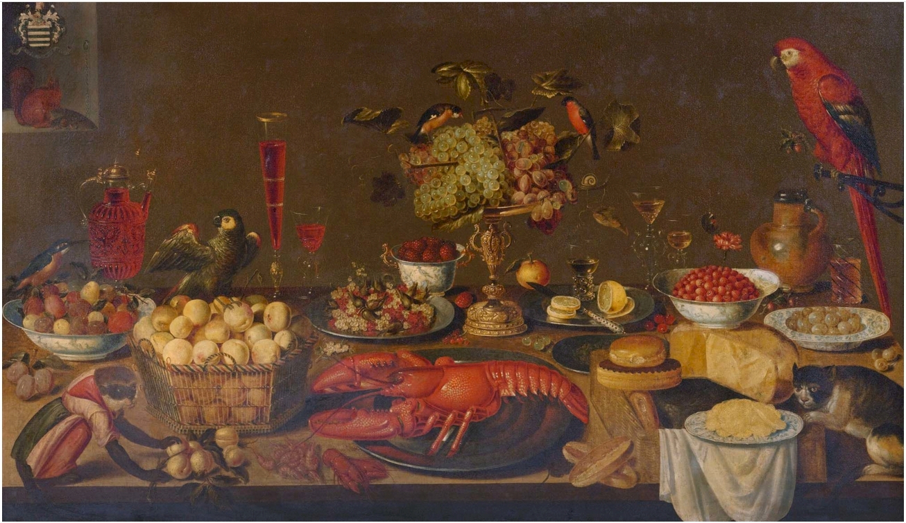 Artus Claessens (fl 1625 – 1644) Large banquet still life with lobster, fruits, wine glasses, porcelain and pewter plates, birds, monkey, squirrel and cat