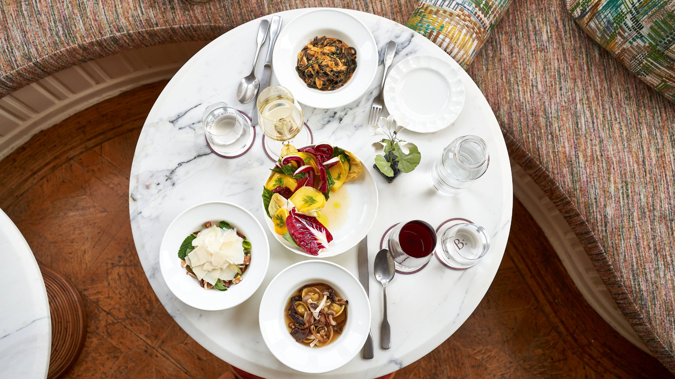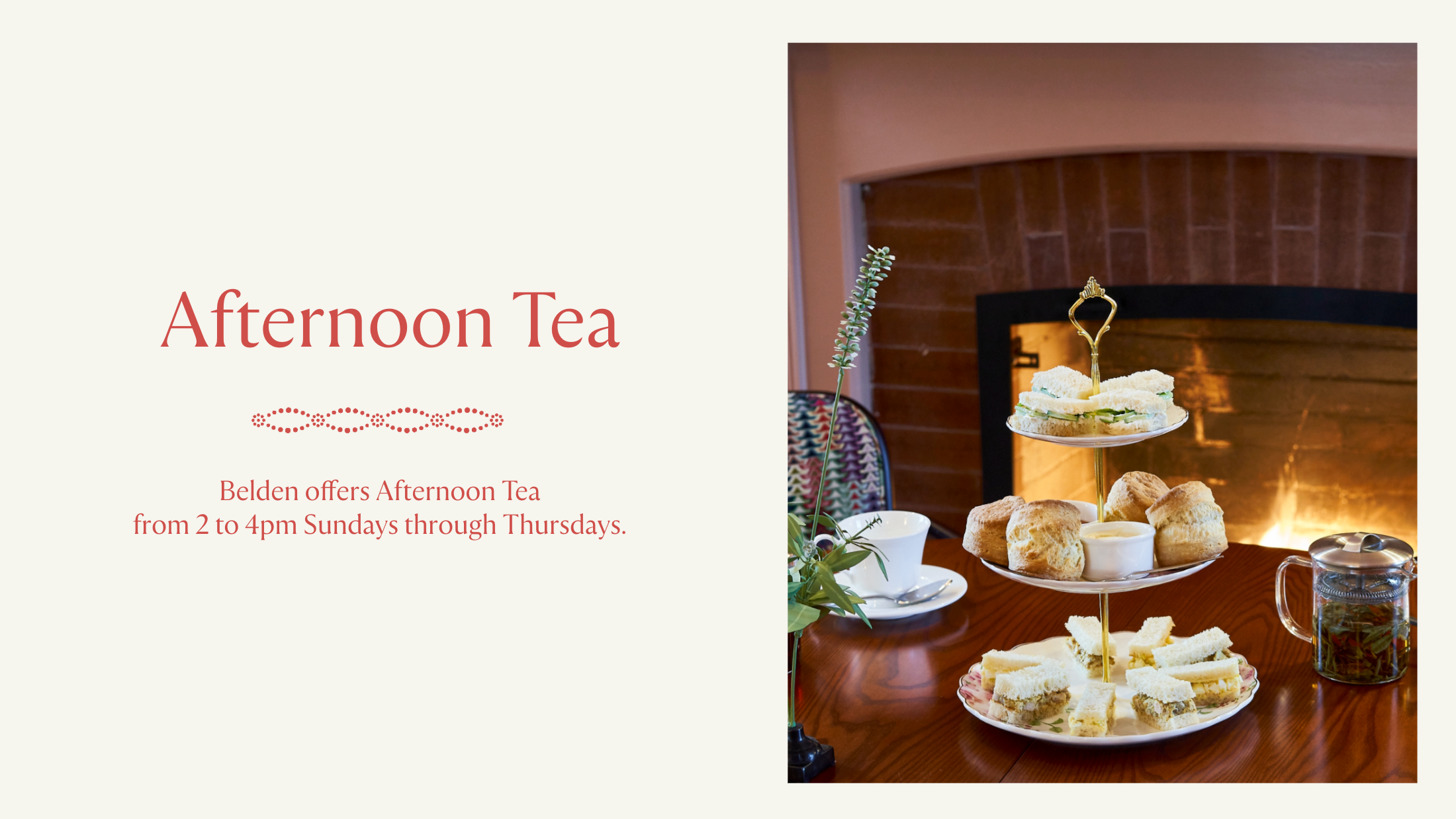 Wood Dragon Oolong, Darjeeling, Lapsang Souchong and White Peony teas by local tea impressario In Pursuit of Tea, which sources the finest single origin leaves directly from farmers, ensuring its quality and purity. Tea service includes a plentiful array of savory and sweet items, such as traditionally inspired tea sandwiches (cucumber, egg salad, curried chicken), scones with clotted cream and jam.
