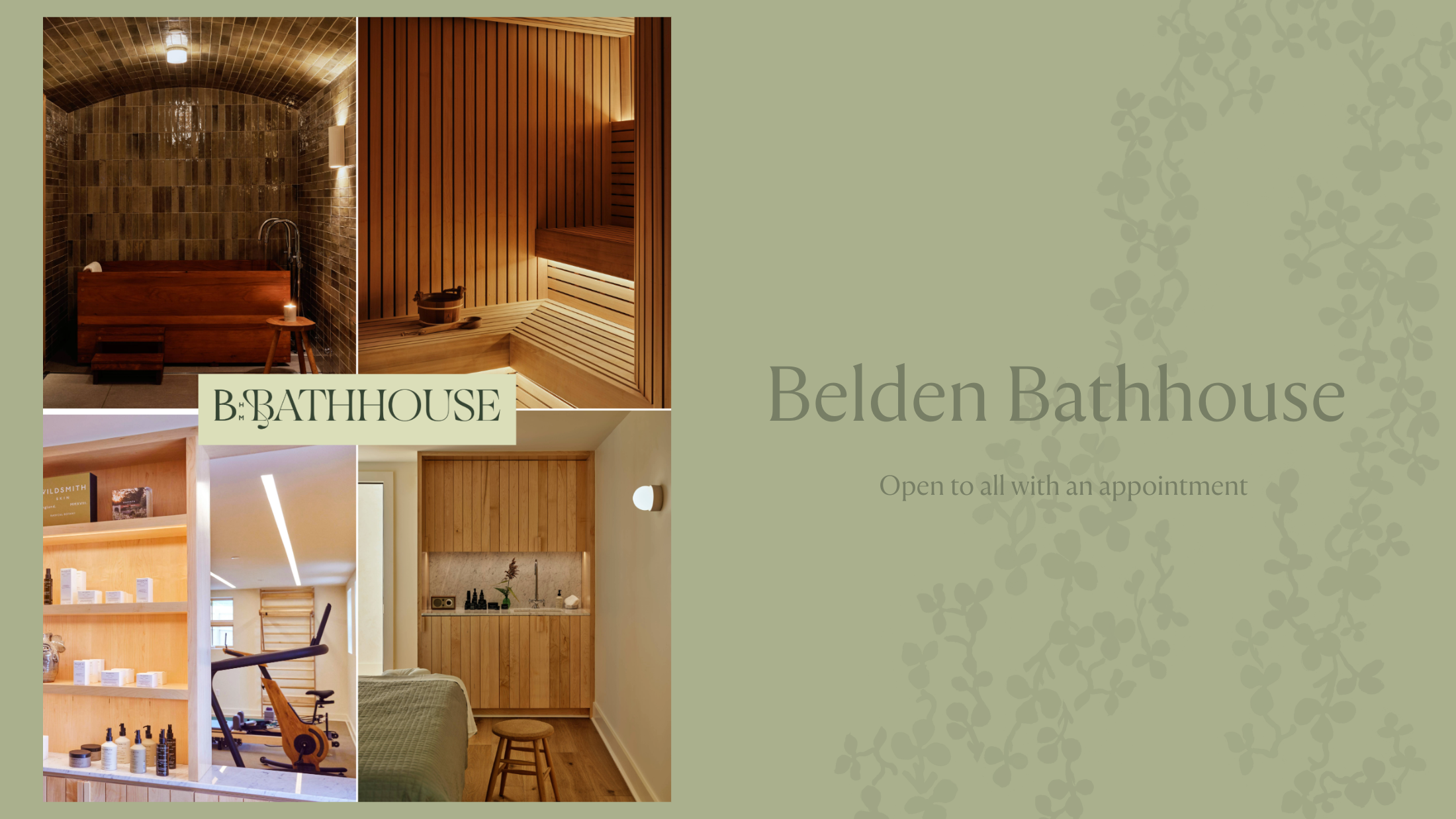 Belden bathhouse beckons with steam, sauna, Ofuro tub for hydrotherapies, NOHRD gym equipment, private Pilates and personal training. Wildsmith wellness treatments, such as Radical Botany Facials, massages and scrubs, use circadian rhythms, helping you to adjust your internal clock to the changing seasons.