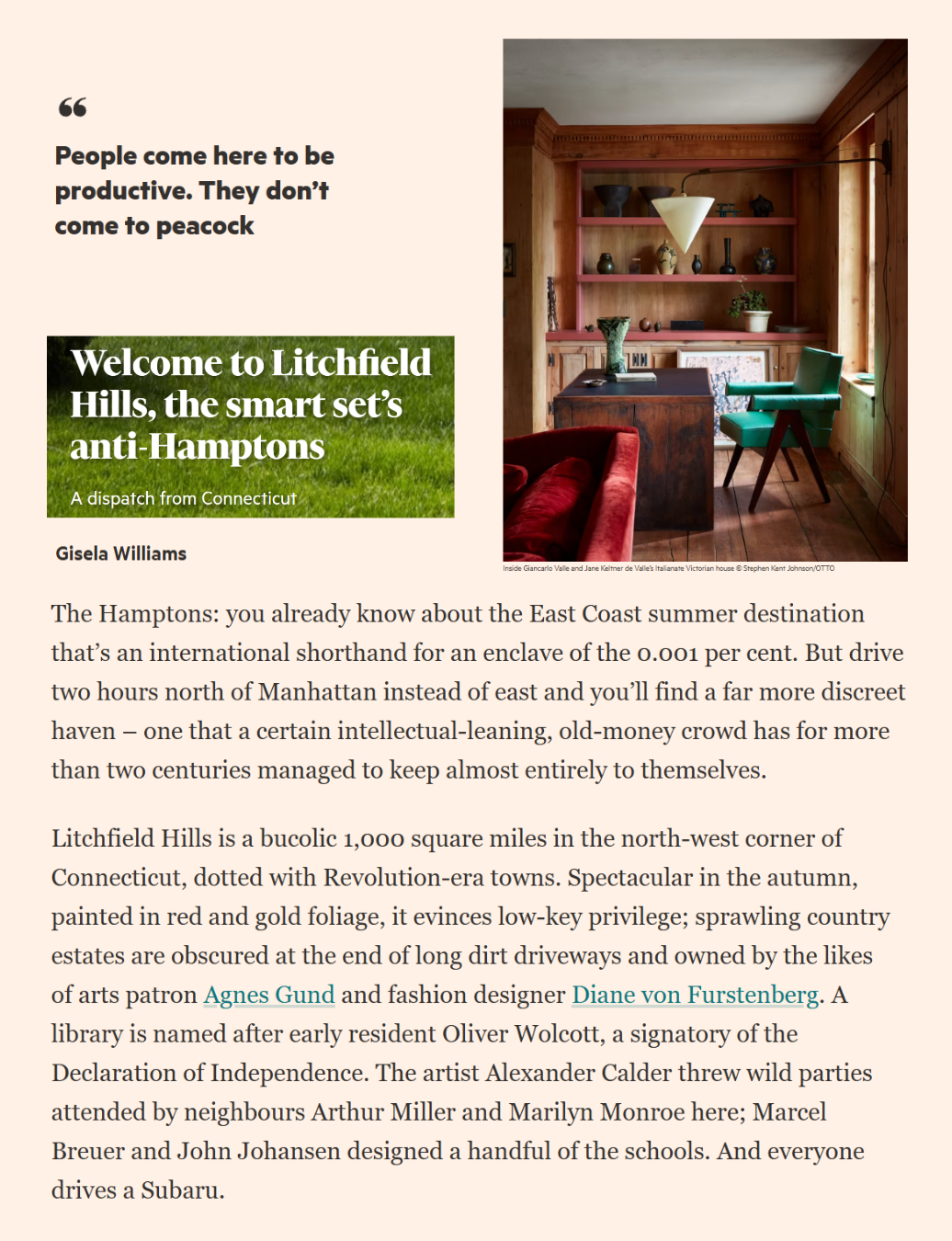 Writer Gisela Williams penned an extraordinary piece on Litchfield County's vibrant cultural, architectural and hospitality offerings. Belden is featured prominently in the best company with our friends at Pink House, Lost Fox Inn, The Abner, the Litchfield Historical Society, Ripley Waterfowl Conservancy, Ed Tang and John Auerbach, Giancarlo Valle and Jane Keltner de Valle, Abby Bangser and many more.
